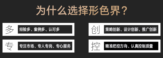 形色界創(chuàng)想聯(lián)盟由形色界品牌策劃設(shè)計(jì)及亦科網(wǎng)絡(luò)組成,創(chuàng)立至今已有20年,擁有多年品牌策略和設(shè)計(jì)經(jīng)驗(yàn)的專業(yè)人才,提供從策略到設(shè)計(jì)、再到監(jiān)管制作及互聯(lián)網(wǎng)傳播的一站式服務(wù)。以國(guó)際化視野、創(chuàng)新性思考和敏銳的市場(chǎng)嗅覺(jué),通過(guò)精準(zhǔn)性、創(chuàng)意性、優(yōu)質(zhì)性的服務(wù),從戰(zhàn)略高度為企業(yè)制定長(zhǎng)遠(yuǎn)的品牌戰(zhàn)略規(guī)劃,幫助品牌實(shí)現(xiàn)可持續(xù)發(fā)展,提升品牌價(jià)值。